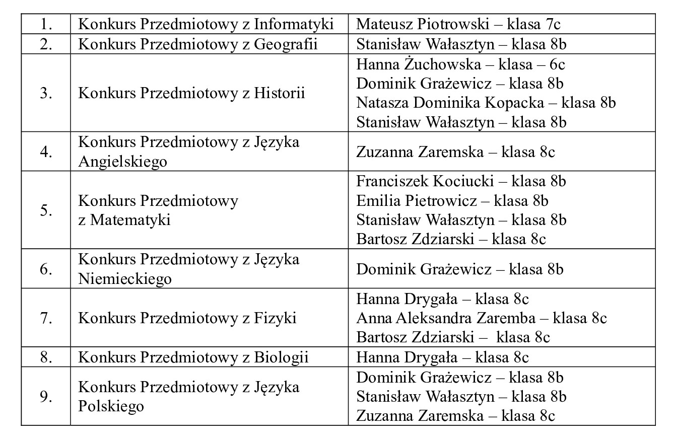 Ponadto Zuzanna Zaremska z klasy 8c zakwalifikowała się do zawodów II stopnia Olimpiady Literatury i Języka Polskiego dla Szkół Podstawowych.