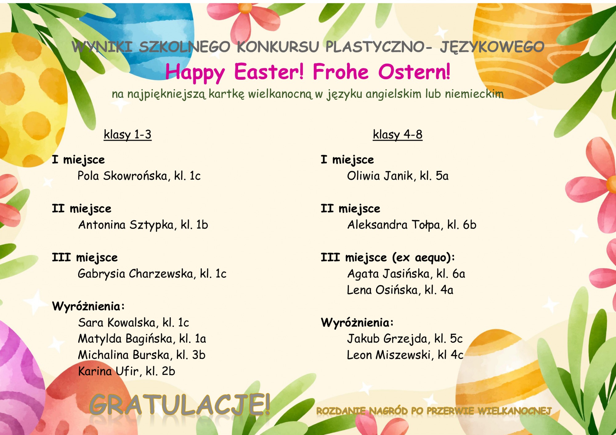 WYNIKI SZKOLNEGO KONKURSU "HAPPY EASTER! FROHE OSTERN"